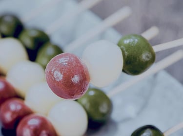 Brochettes de mochis colorées aux saveurs fraise, vanille et matcha.