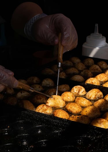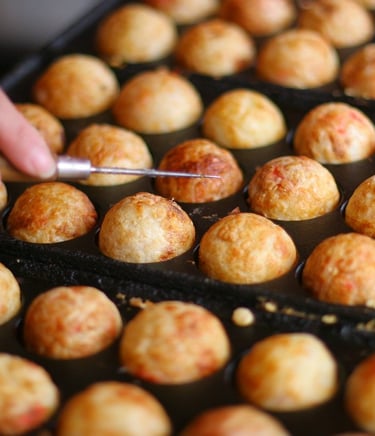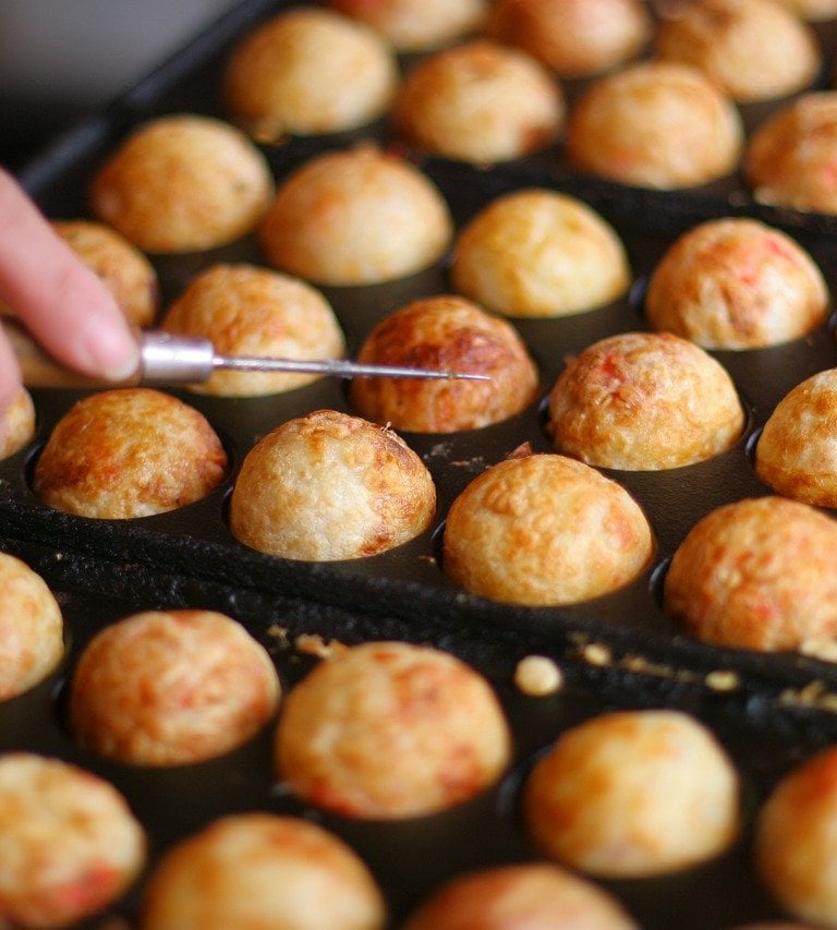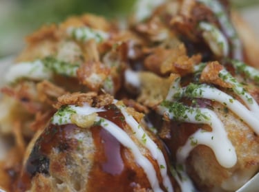 Boulettes garnies de poulpe mariné au yuzu, servies avec katsuobushi, cébette, gingembre, aonori,sauce otafuku et mayonnaise japonaise.